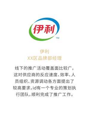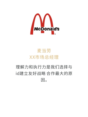 i-d先后經(jīng)歷與Audi、Mercedes-Benz、infiniti、PORSCHE、可口可樂(lè)、麥當(dāng)勞、肯德基、Budweiser、華為、小米、中國(guó)移動(dòng)、ELLE、L'OREAL、萬(wàn)達(dá)、仁恒置地、恒大、碧桂園、蘭桂坊...的業(yè)務(wù)合作,成功地將國(guó)際化的營(yíng)銷策劃理念及執(zhí)行方式融入本土,為更多的中國(guó)企業(yè)開(kāi)啟全新的品牌推廣思路和執(zhí)行方案。